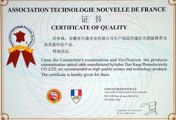 天康光電有限公司生產(chǎn)的通信光纜被法國科技質(zhì)量監(jiān)督評(píng)價(jià)委員會(huì)推薦為高質(zhì)量科技產(chǎn)品